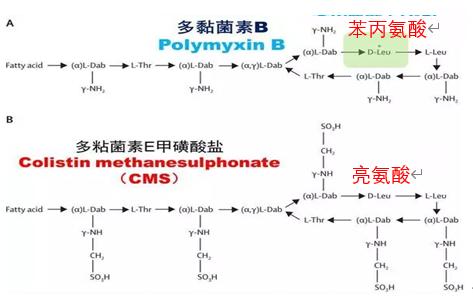 PMB和CST的主要区别在于6号位上一个氨基酸的差异,其中PMB是苯丙氨酸,CST是亮氨酸。供临床用的PMB为其硫酸盐,是具有抗菌活性的产品;而形成鲜明对比的是CST甲磺酸盐(colistimethate sodium ,CMS),抗菌活性部位被甲磺酸盐所掩盖,本身并没有抗菌活性,作为一种前体药物,发挥杀菌作用。