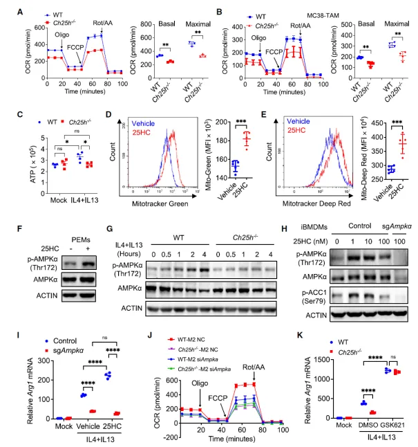 25HC 处理可激活巨噬细胞 AMPKα(Thr172 磷酸化)及其下游靶点 ACC1(Ser79 磷酸化)。AMPKα 缺陷可阻断 25HC 对 Arg1 表达的促进作用,而 AMPKα 激动剂 GSK621 可恢复 Ch25h 敲除巨噬细胞的 Arg1 表达。