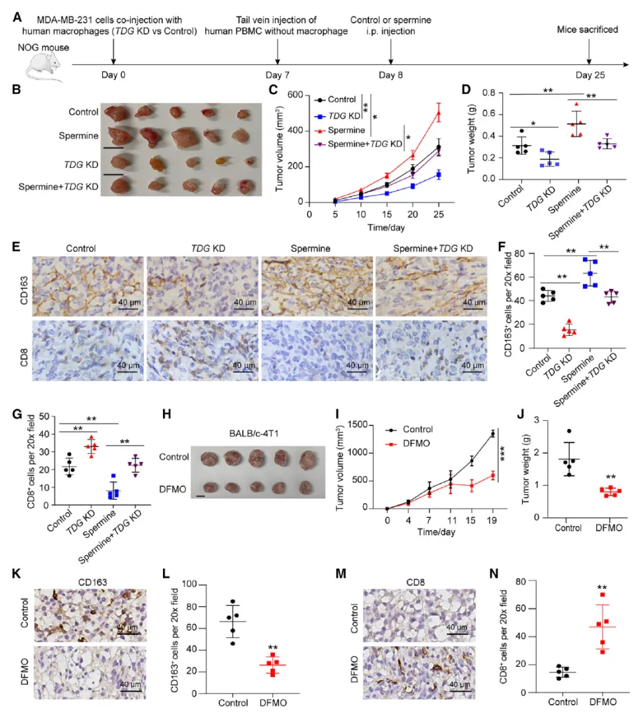 在人源化免疫小鼠模型中,巨噬细胞 TDG 敲低可显著抑制 MDA-MB-231 移植瘤生长,且外源性精胺处理无法逆转该抑瘤效应。