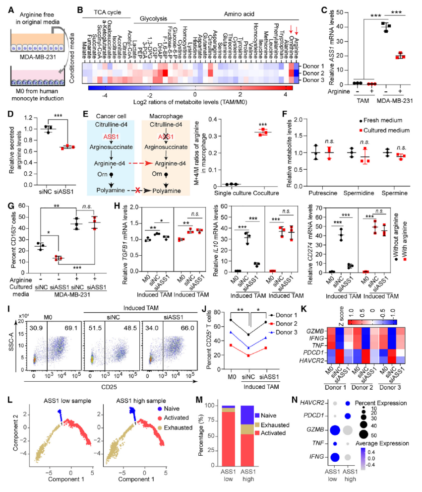 癌细胞条件培养基诱导的 TAMs 中精氨酸代谢增强,且癌细胞 ASS1 敲低会减少精氨酸分泌,抑制 TAM 标志物(CD163、TGFB1)表达,补充精氨酸可恢复该表型。