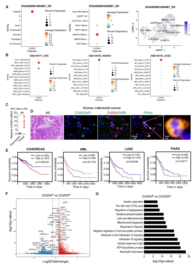 接下来,作者分析了来自人类癌症的单细胞RNA测序(scRNA-seq)数据,表明CH25H 在多种免疫抑制性巨噬细胞亚群(如卵巢癌 MARCO + 巨噬细胞、肾癌 LYVE1 + 巨噬细胞等)中高表达。