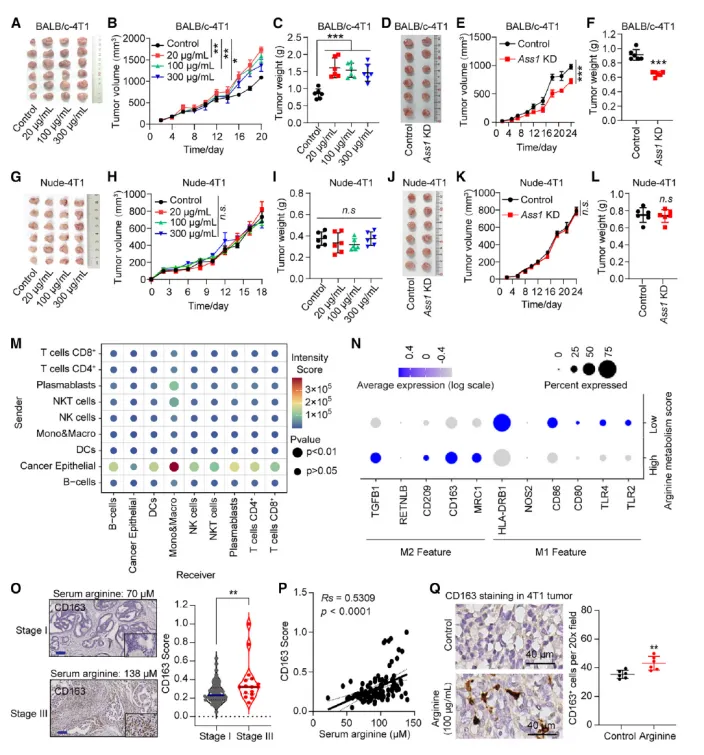 精氨酸处理可剂量依赖性上调巨噬细胞 TGFB1、IL10 等促肿瘤细胞因子表达,CD163(M2 巨噬细胞标志物)在晚期乳腺癌中高表达且与血清精氨酸水平正相关。