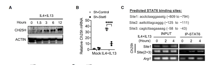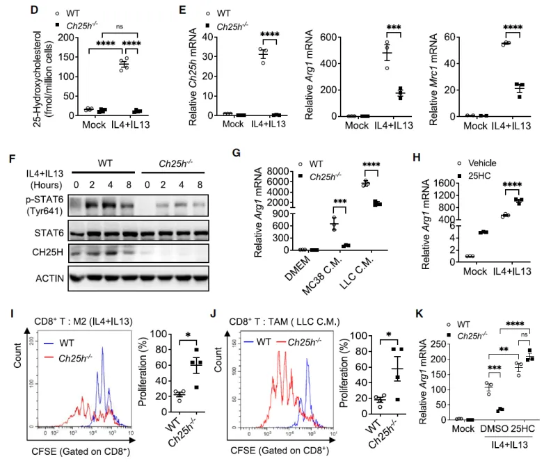 Ch25h 敲除巨噬细胞无法积累 25HC,且 IL-4/IL-13 刺激后 Arg1、Mrc1 等免疫抑制标志物表达降低,STAT6(Tyr641)磷酸化水平下降。