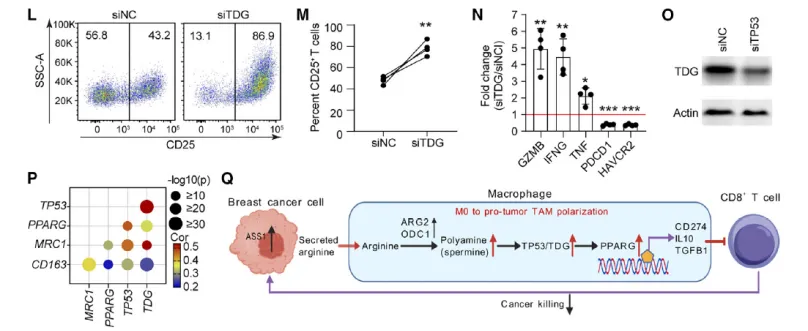 p53 敲低可显著降低精胺诱导的 TDG 表达及 TAM 促肿瘤细胞因子分泌, luciferase 报告基因及 ChIP 实验证实 p53 可直接结合 TDG 启动子。