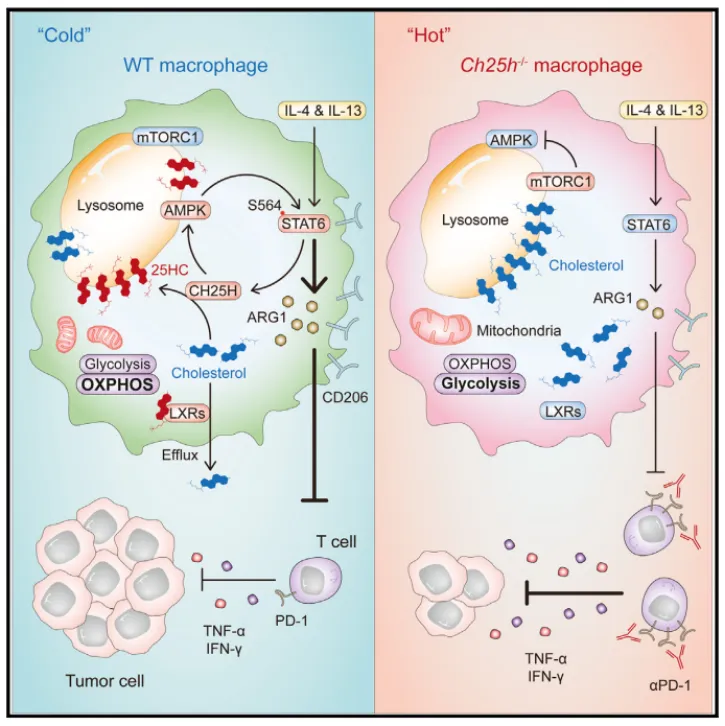 2024年5月,中国科学院分子细胞科学卓越创新中心王红艳研究员联合上海大学生科院魏滨教授,复旦大学生科院唐惠儒教授及上海交通大学叶幼琼研究员在Immunity杂志上发表题为25-Hydroxycholesterol regulates lysosome AMP kinase activation and metabolic reprogramming to educate immunosuppressive macrophages的研究论文,阐明了肿瘤相关巨噬细胞(TAMs)中 CH25H-25HC 通过溶酶体AMPKα 信号通路调控 STAT6 Ser564 磷酸化、诱导免疫抑制表型的分子机制,为提升抗 PD-1 治疗疗效提供了新的理论依据与潜在靶点。