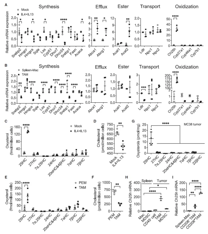 CH25H 在上述三种巨噬细胞中均显著上调,且通过 LC-MS 检测证实 25HC 在这些巨噬细胞及 MC38 肿瘤组织中大量积累。