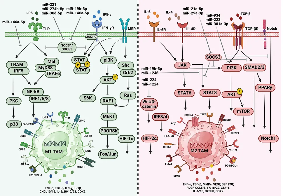 M1型巨噬细胞在发育与成熟过程中,会表达TLRs,识别LPS等病原体相关分子模式,激活下游包括NF-κB、p38 MAPK、JAK/STAT1、PI3K/Akt/Fos/Jun 等信号通路,诱导巨噬细胞向M1型极化;细胞因子信号抑制因子如 SOCS1/3 可下调M1极化;