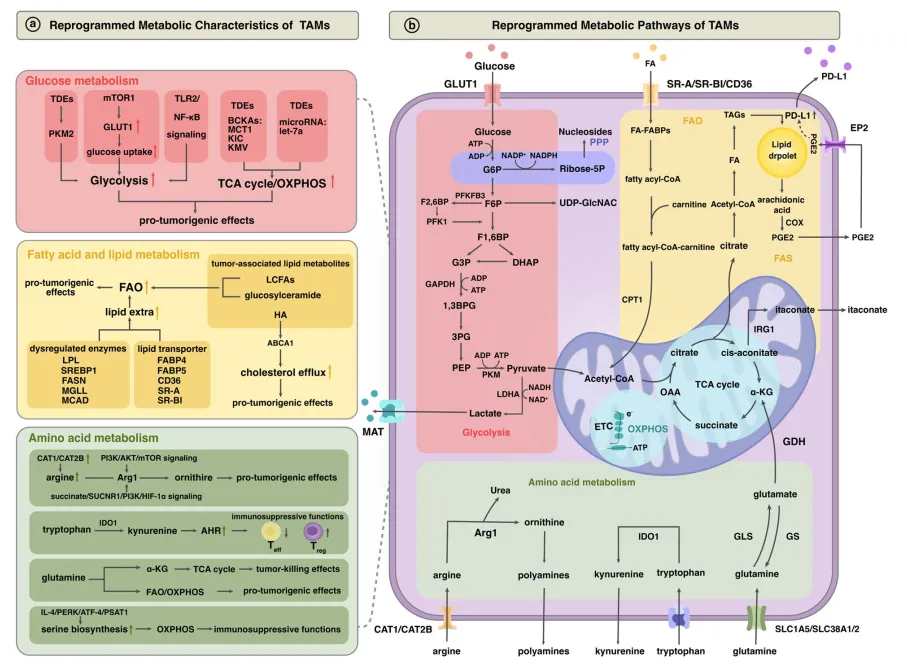 (1)TAM呈现出独特的代谢特征,其葡萄糖与脂肪酸代谢水平显著增强,为自身的免疫抑制作用和促肿瘤活性提供代谢支撑。TAM的糖酵解、三羧酸循环、氧化磷酸化过程均被激活,脂肪酸氧化及胆固醇外排过程也同步增强。此外,在响应微环境信号的过程中,TAM特有的代谢通路(尤其是涉及特定氨基酸的代谢通路),是其功能异质性形成的核心分子基础。
