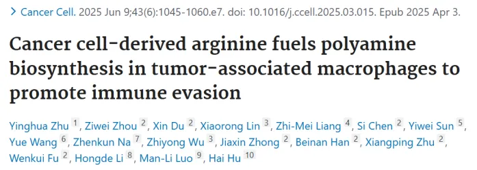 2025 年 6 月,浙江省肿瘤医院,中国科学院杭州医学研究所胡海教授团队在国际著名期刊 Cancer Cell 杂志上发表题为 Cancer cell-derived arginine fuels polyamine biosynthesis in tumor-associated macrophages to promote immune evasion 的研究论文,阐明了乳腺癌细胞分泌的精氨酸可诱导肿瘤相关巨噬细胞(TAMs)向促肿瘤表型极化,进而抑制 CD8⁺ T 细胞的抗肿瘤活性的分子机制,为靶向 “精氨酸 - 多胺 - TDG” 代谢轴重塑肿瘤免疫微环境、提升乳腺癌免疫治疗疗效提供了新的理论依据与潜在靶点。