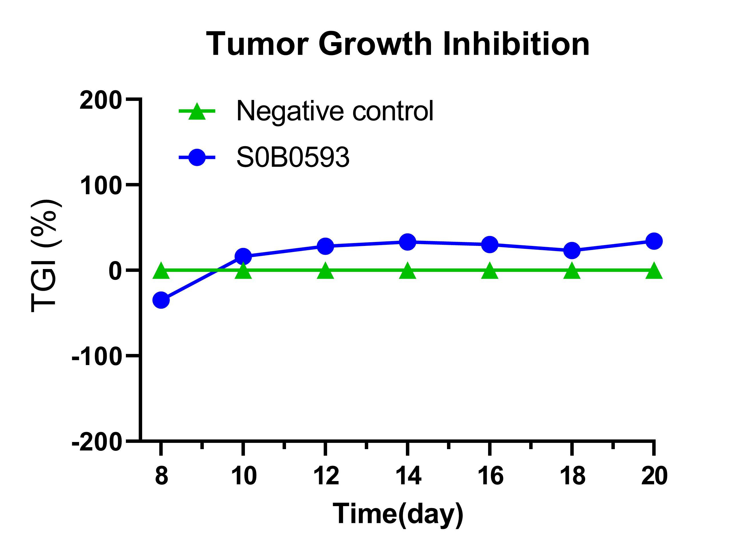 肿瘤体积变化:对比阴性对照组,S0B0593 处理组的肿瘤体积增长明显放缓,在实验末期(第 20 天)肿瘤体积显著低于对照组;
