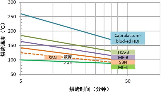 固化性封闭型异氰酸酯的固化窗(线上方为凝胶率90%以上的区域)