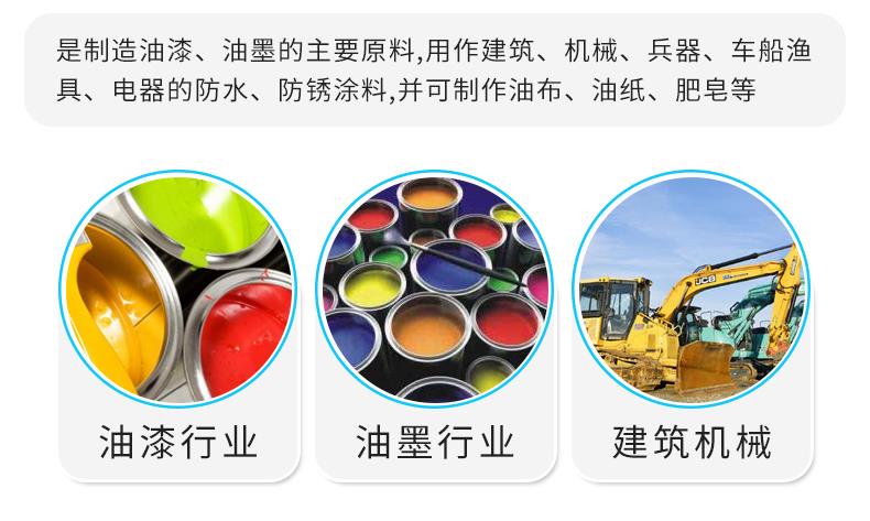 桐油是一种优良的带干性植物油,具有干燥快、比重轻、光泽度好、附着力强、耐热、耐酸、耐碱、防腐、防锈、不导电等特性,用途广泛。它是制造油漆、油墨的主要原料,大量用作建筑、机械、兵器、车船、渔具、电器的防水、防腐、防锈涂料,并可制作油布、油纸、肥皂、农药和医药用呕吐剂、杀虫剂等。