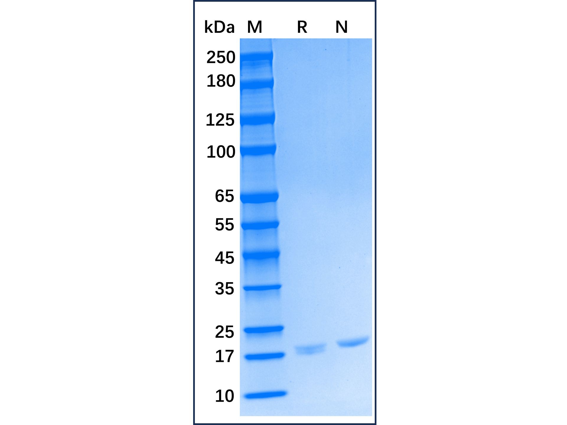 2.5 μg/lane of Recombinant Mouse G-CSF was resolved with SDS-PAGE under reducing (R) and non-reducing (N) conditions and visualized by Coomassie® Blue staining, showing a band at 20.2 kDa.