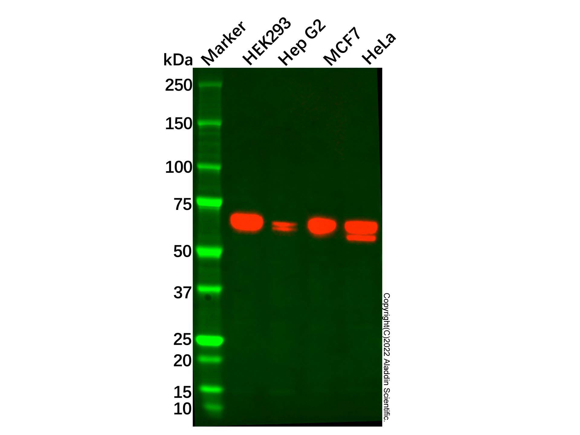 阳性对照:WB: HEK293, HeLa, MCF7 and Hep G2 cell lysates. IF: HeLa cells.