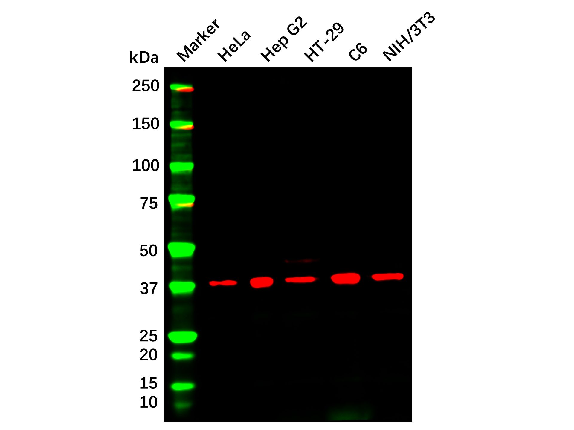 阳性对照:WB: HeLa, Hep G2, HT-29, C6 and NIH/3T3 cell lysates.
