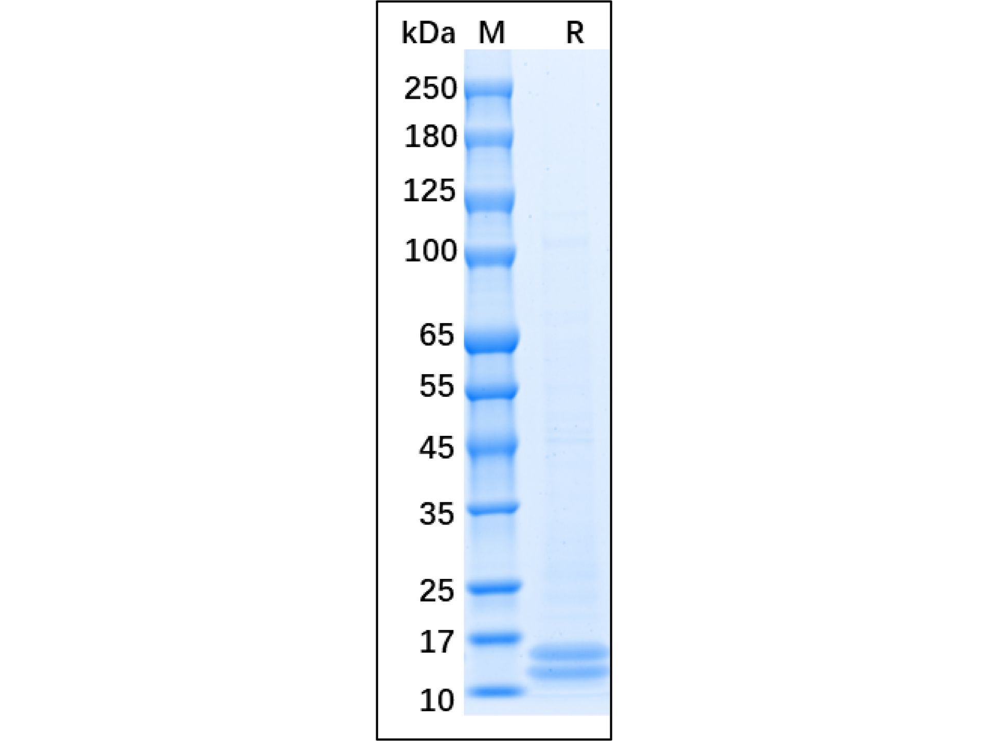 2.5μg/lane of Recombinant Human MCP1 Protein was resolved with SDS-PAGE under reducing (R) conditions and visualized by Coomassie® Blue staining, showing bands at 13.3&15.3 kDa.