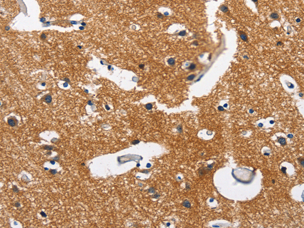 The image is immunohistochemistry of paraffin-embedded Human brain tissue using (CAMK1D Antibody) at dilution 1/50. (Original magnification: ×200)