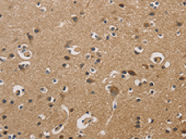 The image is immunohistochemistry of paraffin-embedded Human brain tissue using (DUSP23 Antibody) at dilution 1/20. (Original magnification: ×200)