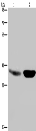Gel: 8%SDS-PAGE, Lysate: 40 μg, Lane 1-2: Human fetal brain tissue, mouse brain tissue, Primary antibody: (MAPRE3 Antibody) at dilution 1/500, Secondary antibody: Goat anti rabbit IgG at 1/8000 dilution, Exposure time: 5 seconds