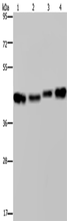Gel: 8%SDS-PAGE, Lysate: 40 μg, Lane 1-4: HepG2 cells, Raji cells, A431 cells, 231 cells, Primary antibody: (DNAJA1 Antibody) at dilution 1/800, Secondary antibody: Goat anti rabbit IgG at 1/8000 dilution, Exposure time: 5 seconds