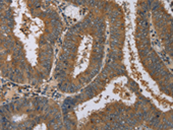 The image is immunohistochemistry of paraffin-embedded Human colon cancer tissue using (DNAJA1 Antibody) at dilution 1/60. (Original magnification: ×200)