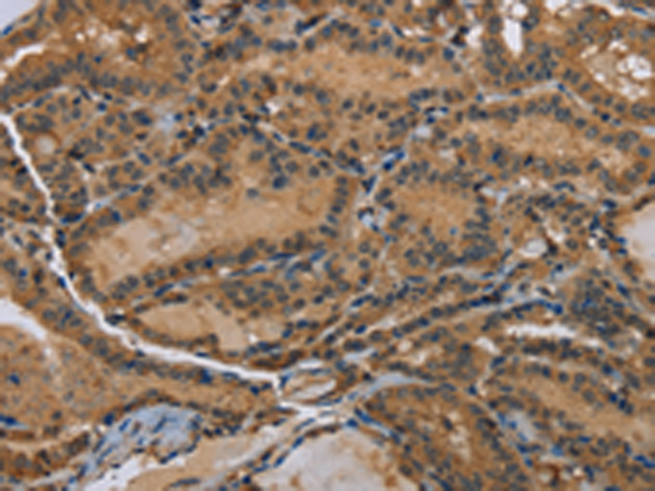 The image is immunohistochemistry of paraffin-embedded Human thyroid cancer tissue using (DNAJA1 Antibody) at dilution 1/60. (Original magnification: ×200)