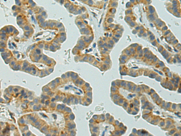 The image is immunohistochemistry of paraffin-embedded Human thyroid cancer tissue using (VPS39 Antibody) at dilution 1/150. (Original magnification: ×200)