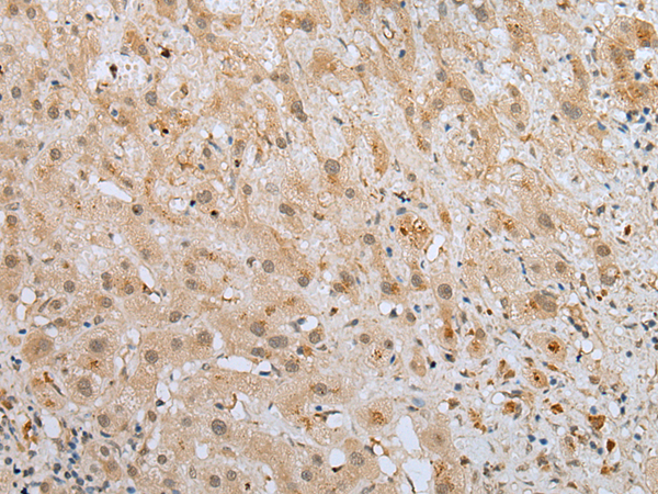 The image is immunohistochemistry of paraffin-embedded Human liver cancer tissue using (ZNF248 Antibody) at dilution 1/25. (Original magnification: ×200)