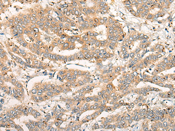 The image is immunohistochemistry of paraffin-embedded Human gastric cancer tissue using (CPNE4 Antibody) at dilution 1/40. (Original magnification: ×200)