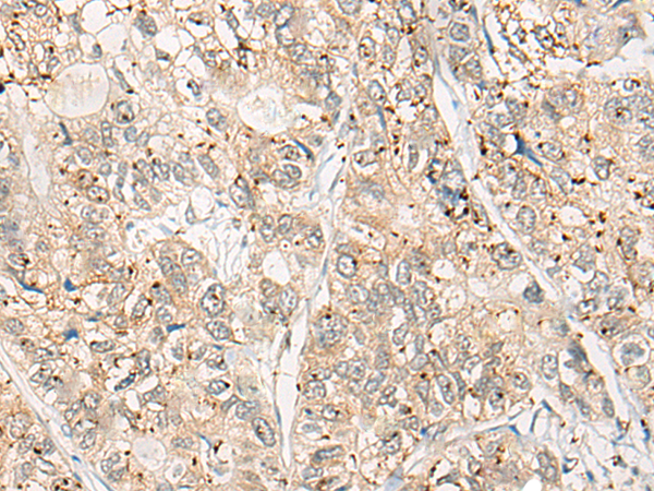 The image is immunohistochemistry of paraffin-embedded Human liver cancer tissue using (CPNE4 Antibody) at dilution 1/40. (Original magnification: ×200)