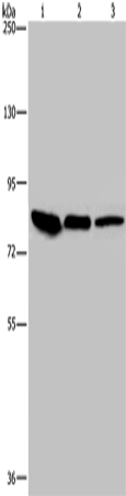 Gel: 6%SDS-PAGE, Lysate: 40 μg, Lane 1-3: Mouse skin tissue, HUVEC cells, Hela cells, Primary antibody: (JUP Antibody) at dilution 1/850, Secondary antibody: Goat anti rabbit IgG at 1/8000 dilution, Exposure time: 10 seconds