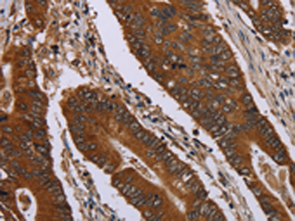 The image is immunohistochemistry of paraffin-embedded Human colon cancer tissue using (JUP Antibody) at dilution 1/40. (Original magnification: ×200)