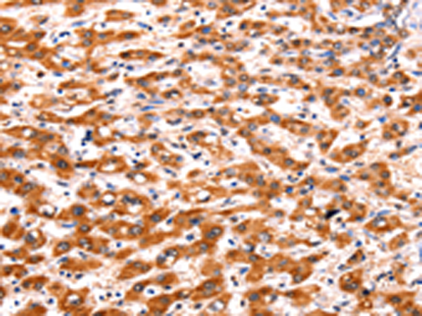 The image is immunohistochemistry of paraffin-embedded Human liver cancer tissue using (FBLN1 Antibody) at dilution 1/47. (Original magnification: ×200)