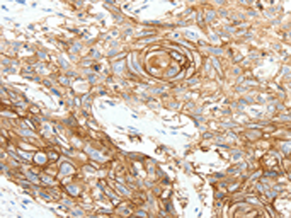 The image is immunohistochemistry of paraffin-embedded Human esophagus cancer tissue using (SCN10A Antibody) at dilution 1/25. (Original magnification: ×200)