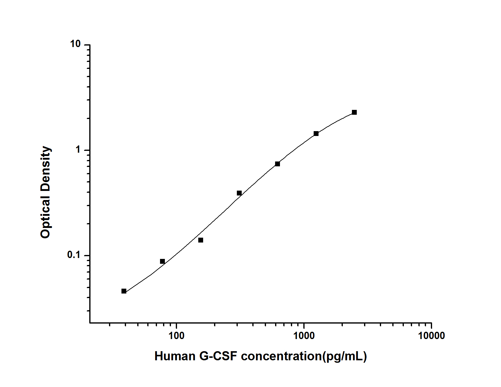 为了进行计算,请对每个参考标准品和每个样品的OD450重复读数取平均值,然后减去平均对照(零)OD450读数。可以将标准曲线绘制为每种参考标准溶液的相对OD450 [Y]与每种标准溶液各自的浓度(X)的关系。样品的G-CSF浓度可以从标准曲线内插。