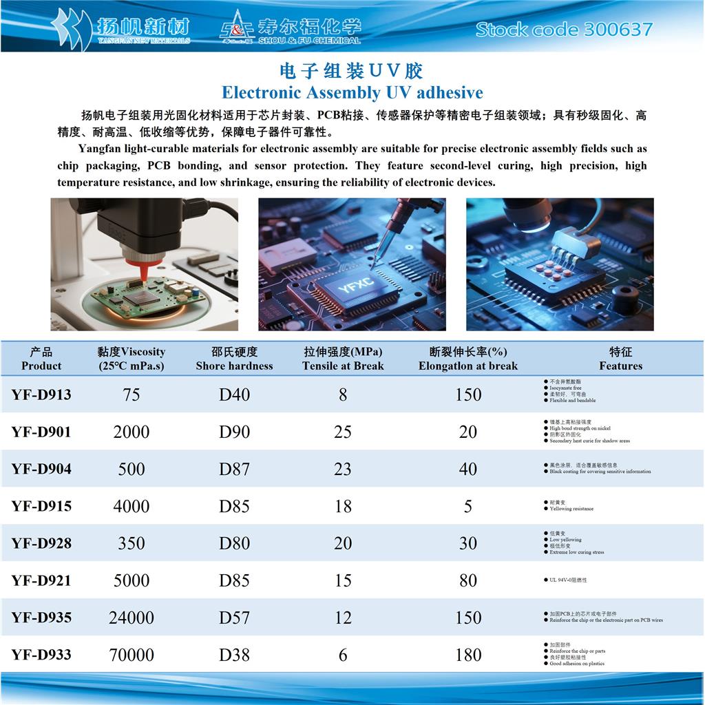 扬帆电子组装用光固化材料是一款专为精密电子制造领域设计的高性能材料,广泛应用于芯片封装、PCB板粘接、传感器保护及微电子组件封装等多个关键环节。该材料在紫外光照射下可实现秒级快速固化,极大提升了生产效率,同时具备优异的成型精度,能够满足微米级别的组装要求。其固化后结构致密,具有出色的耐高温性能和极低的热收缩率,有效避免了因热应力或环境变化引起的形变与老化问题,从而显著增强电子器件的长期稳定性和使用可靠性,适用于高密度、高复杂度电子产品的制造与保护。