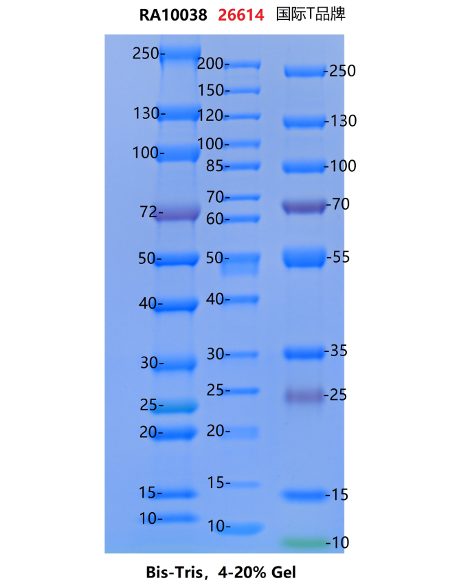 * 本产品准确度显著优于国际品牌,72kDa处偏差较大,其他条带等同或优于国际品牌。